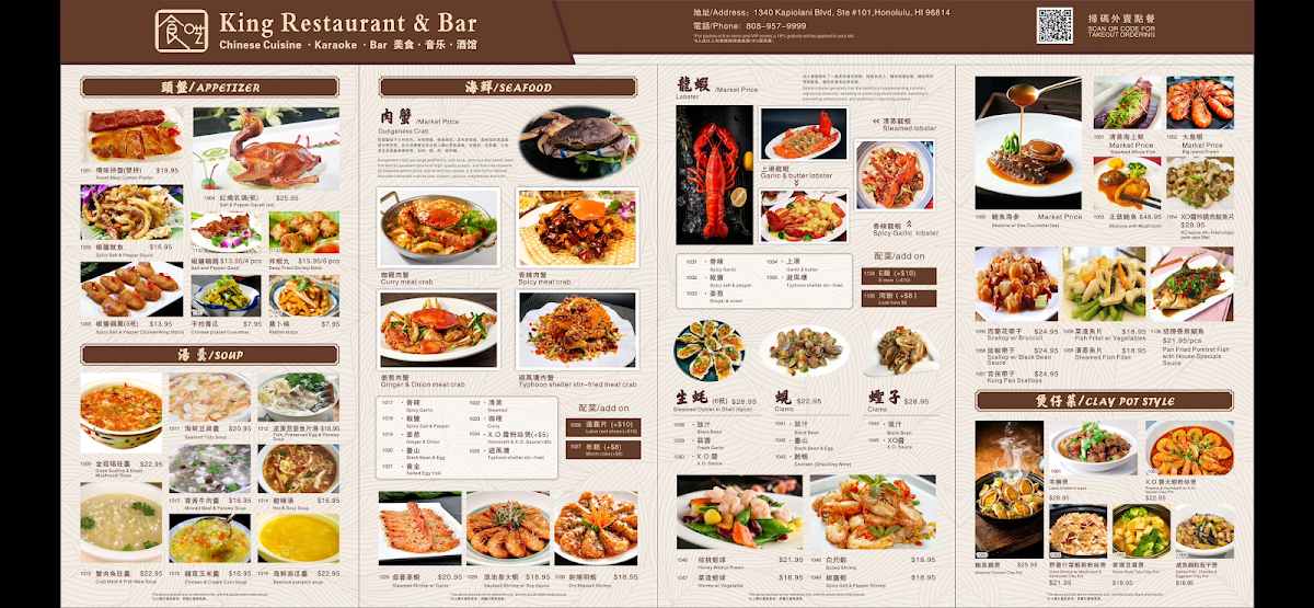 Welcome to King Restaurant & Bar, an exquisite culinary destination located at 1340 Kapiolani Blvd #101 in Honolulu. Specializing in Chinese cuisine, this restaurant offers a diverse menu that promises to delight your taste buds. The culinary journey here begins with enticing soups such as the Crab Meat & Fish Maw Soup and the richly flavored Dried Scallop & Enoki Mushroom Soup. For those craving hearty meals, the Clay Pot Style options include the savory Salted Fish, Chicken & Eggplant Clay Pot.